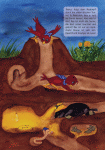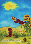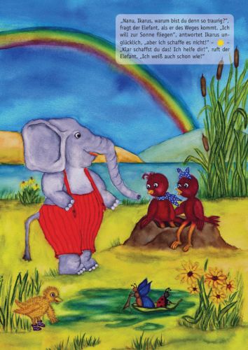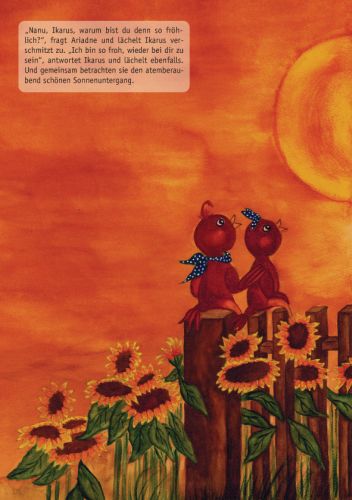 Nanu, wer sitzt denn dort so traurig auf dem Zaun neben dem Sonnenblumenfeld? Es ist der Vogeljunge Ikarus! Sein größter Traum ist es, hinauf zur Sonne zu fliegen. Aber er ist zu klein und seine Flügel sind zu kurz. Er schafft es nicht und ist untröstlich.